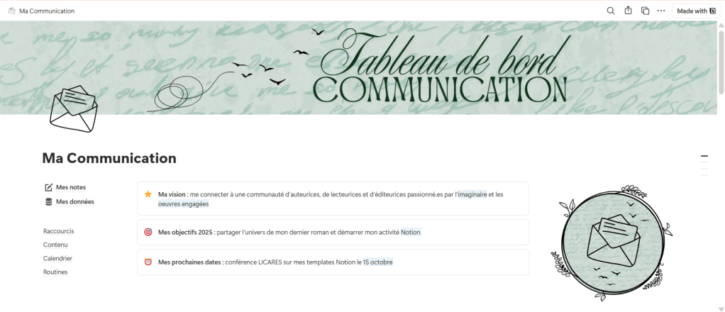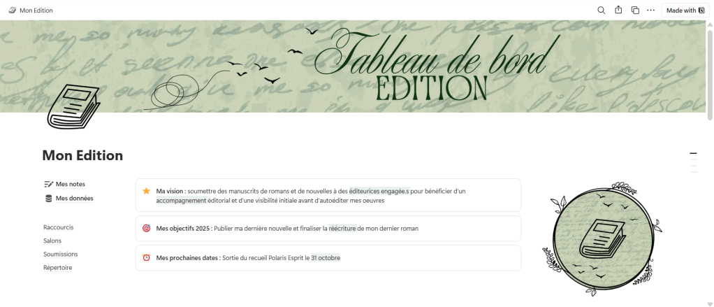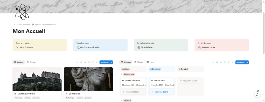 Pour organiser mes projets d’écriture, mais aussi mes publications sur les réseaux sociaux, mes lectures et mes services presses… j’utilise Notion.